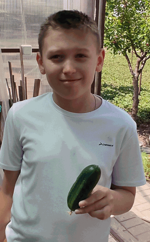 | Спасибо Надежда за хорошие слова!! Вот и первый огурец в теплице созрел для внука!! Хорошо наши труды не прошли даром!!